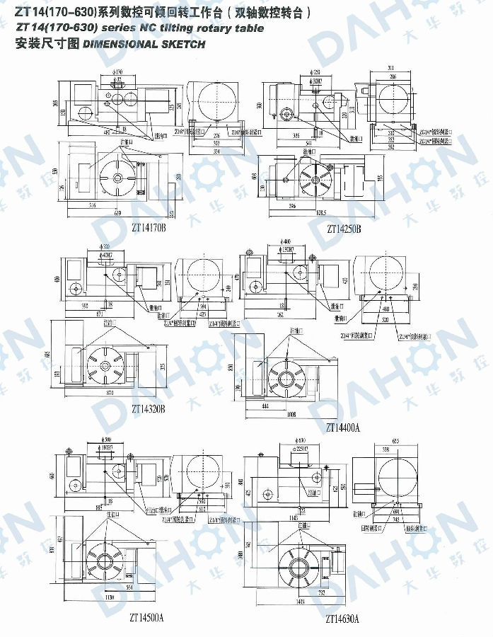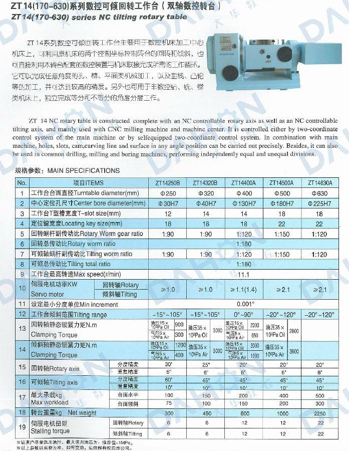 ZT14系列數(shù)控可傾回轉(zhuǎn)工作臺(tái)主要用于數(shù)控機(jī)床加工中心機(jī)床上,可利用原機(jī)床的兩個(gè)控制坐標(biāo)控制轉(zhuǎn)臺(tái)的回轉(zhuǎn)和傾斜,也可直接利用本轉(zhuǎn)臺(tái)配套的數(shù)控裝置與機(jī)床聯(lián)接完成所需的工作循環(huán)。它可以完成任意角度的孔、槽、平面類(lèi)機(jī)械加工,以及曲線(xiàn)、凸輪等的加工,并可達(dá)到較高的精度。另外也可用于非數(shù)控鉆、銑、鏜類(lèi)機(jī)床上,獨(dú)立完成等分和不等分的角度分度工作。該設(shè)備是一種雙軸數(shù)控轉(zhuǎn)臺(tái)。