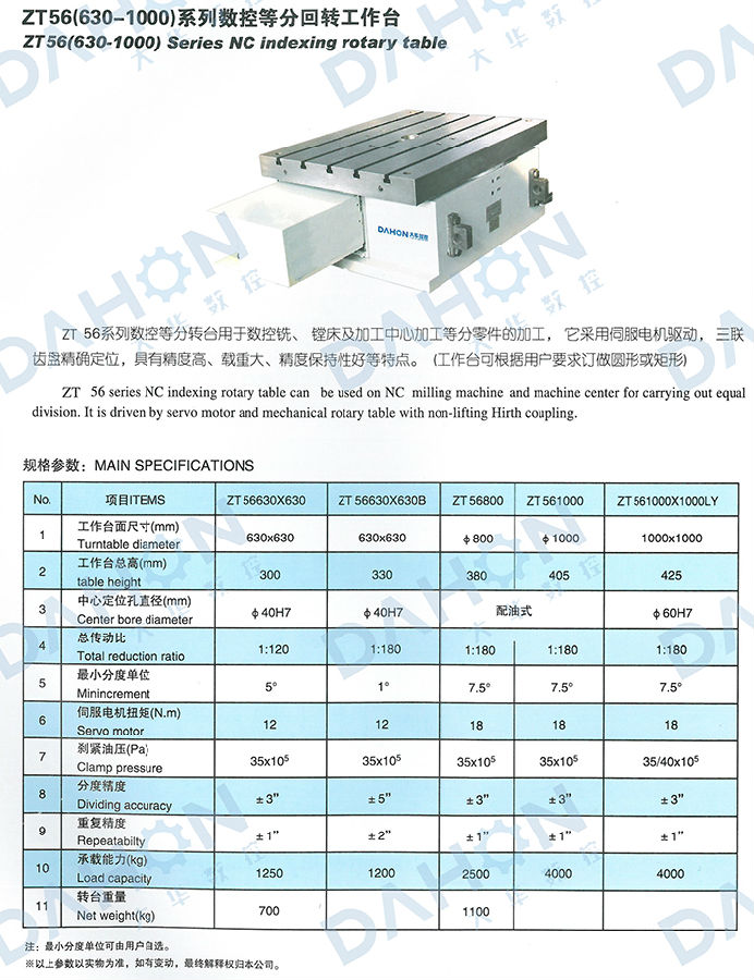 ZT56(630-1000)系列數(shù)控等分回轉(zhuǎn)工作臺用于數(shù)控銑、鏜床及加工中心加工等分零件的加工,它采用伺服電機(jī)驅(qū)動,三聯(lián)齒盤精確定位,具有精度高、載重大、精度保持性好等特點(diǎn)。(工作臺可根據(jù)用戶要求訂做圓形或矩形)